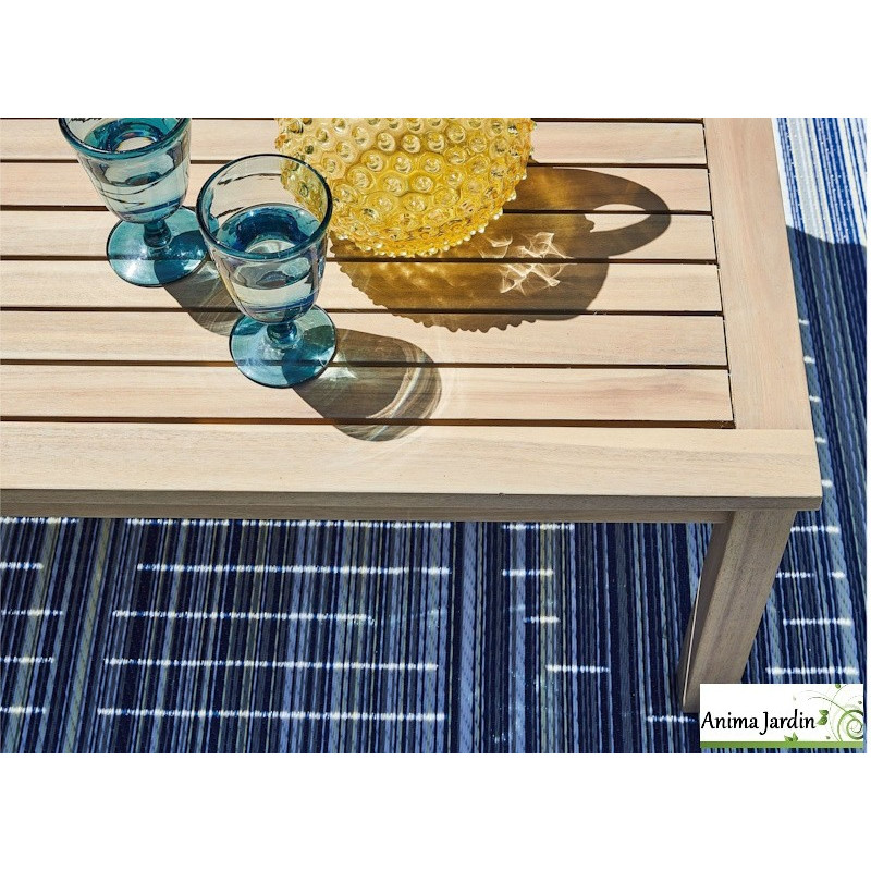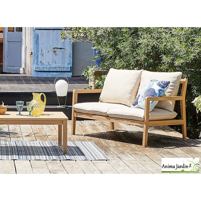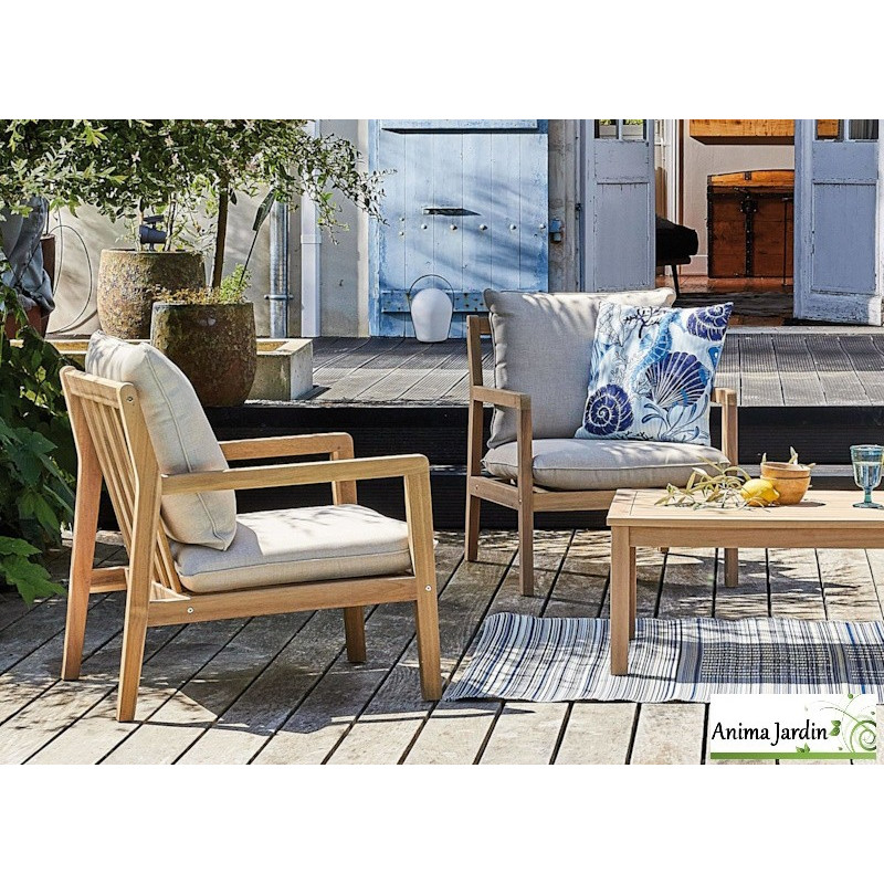La structure est en acacia éco-certifié FSC®, garantissant un matériau respectueux de l'environnement. Le coloris naturel s'intègre parfaitement dans tous les styles de jardin. Les coussins sont équipés de housses en polyester (220gr/m²) avec un traitement déperlant. Les coussins d'assise et de dossier sont déhoussables et d'une épaisseur de 12 cm, offrant un confort optimal. La densité des coussins d'assise est de 20 kg/m³, garantissant une expérience de détente agréable.
