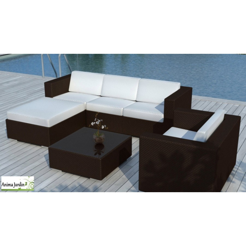 Le salon de jardin Mundaka, en résine tressée noire, offre une modularité exceptionnelle avec un sofa d'angle, un fauteuil, et une table basse. Confortable et élégant, il s'intègre parfaitement à tout espace extérieur.