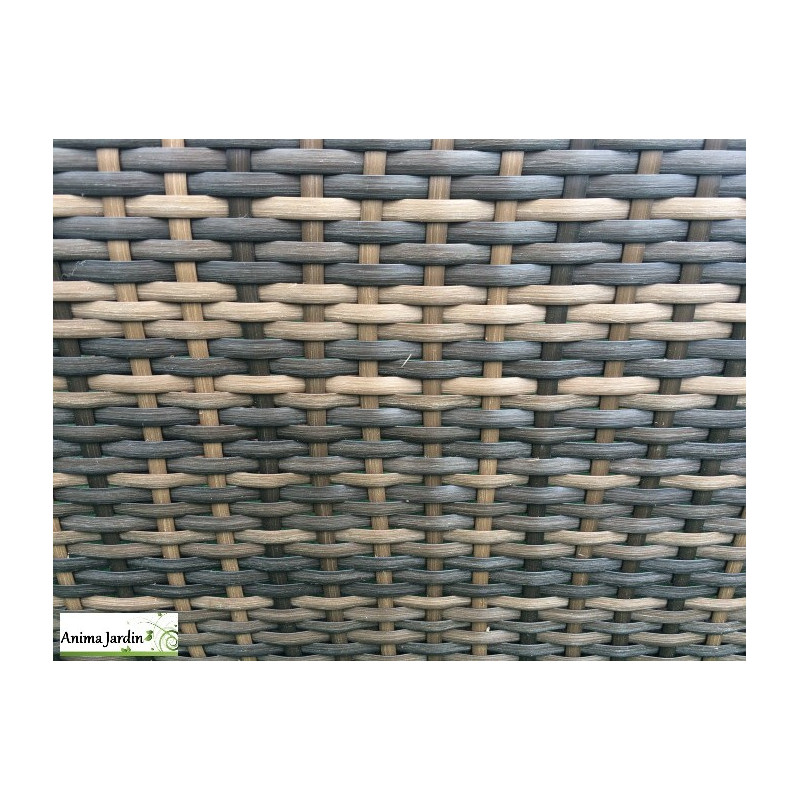 | Matières | - Résine plate 4 fils : fibre synthétique teintée dans la masse et traitée anti-UV. - Structure : 100% Aluminium - épaisseur 1,2 mm - Coussin : mousse Polyuréthane + housse 100% Polyester 250g/m2 - Plateau verre : sécurit épaisseur 5 mm |