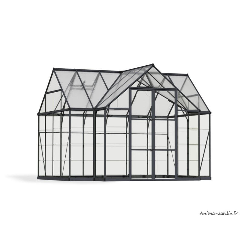 Laissez-vous captiver par la splendeur de cette exceptionnelle serre de jardin en aluminium gris, la Victory Orangerie. Agrémentée d'une avancée qui confère un charme indéniable à votre espace extérieur, cette serre est une véritable œuvre d'art.
