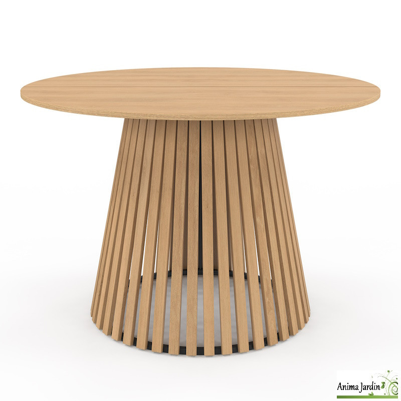 La table à manger Camelia séduit par son design élégant et son style chaleureux grâce à son plateau rond de 110 cm en panneaux de particules mélaminé de 15 mm et lattes en MDF. Son pied central en métal de 16 x 16 mm avec un diamètre de 70 cm assure une excellente stabilité tout en apportant une touche moderne.