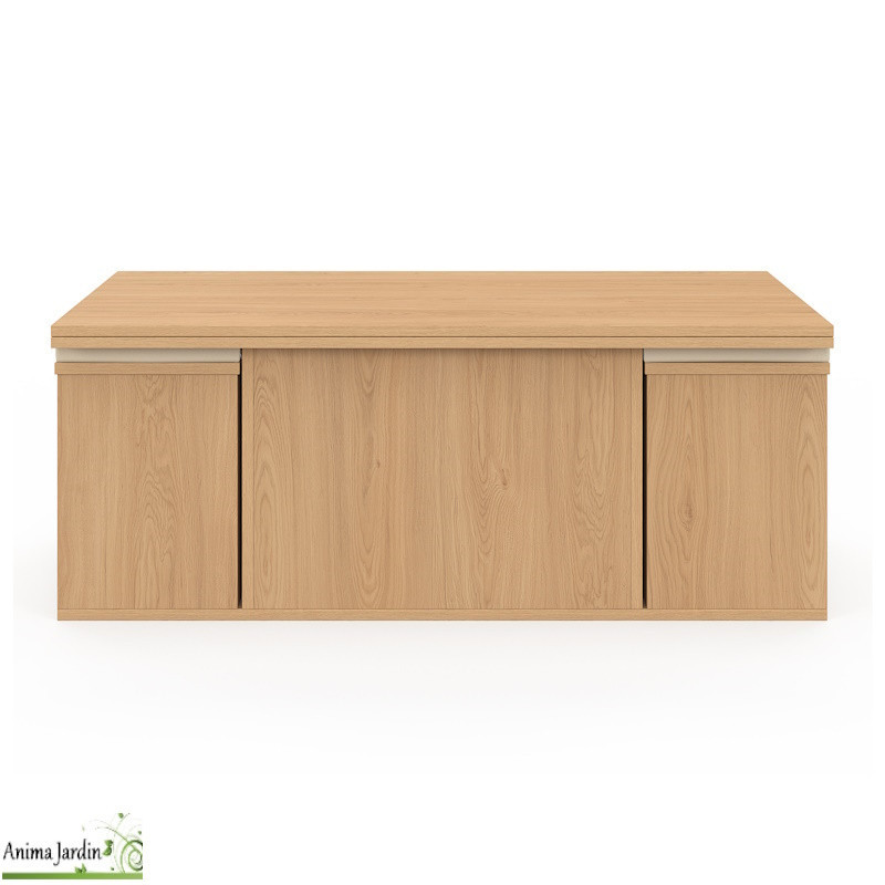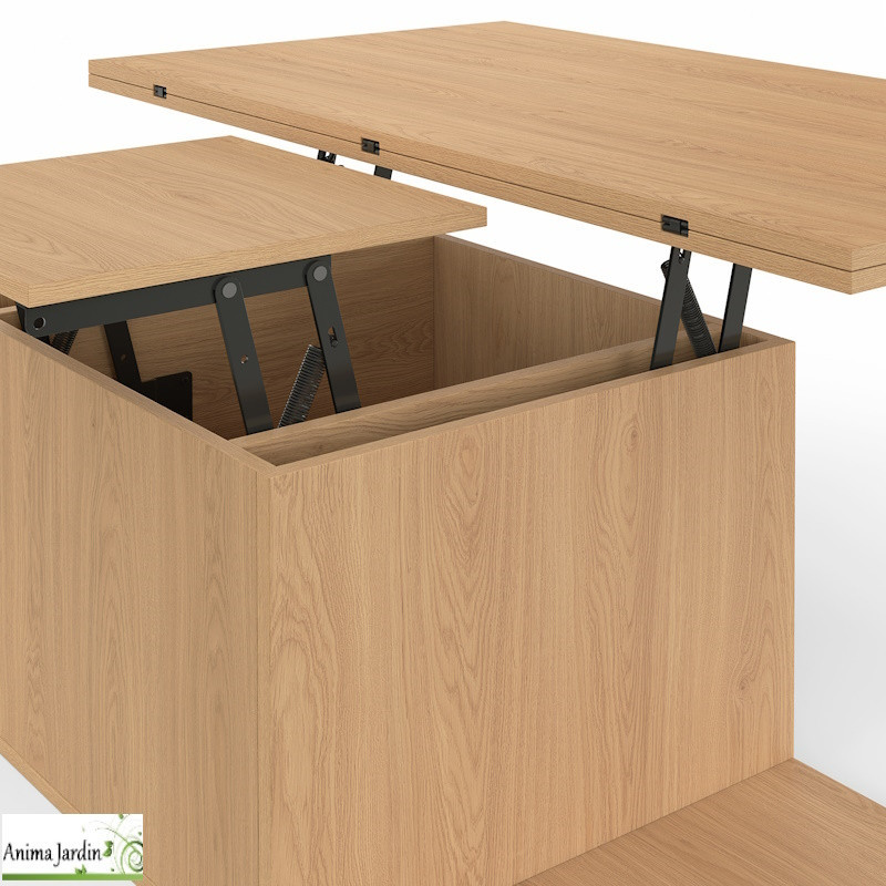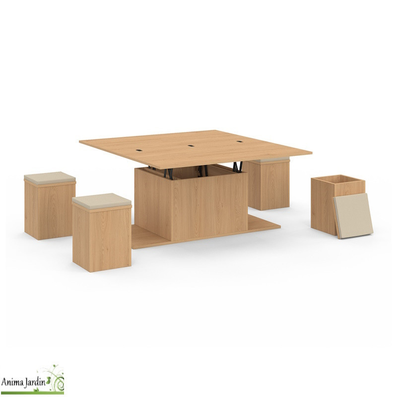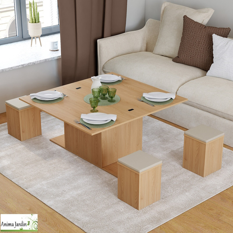 Maximisez l’espace et le confort de votre salon avec la table basse Tania, un meuble 2-en-1 ingénieux au design bois naturel chaleureux. Son plateau relevable vous permet de transformer facilement cette table en espace repas ou de travail, tandis que ses 4 poufs intégrés offrent des assises d’appoint discrètes et pratiques.