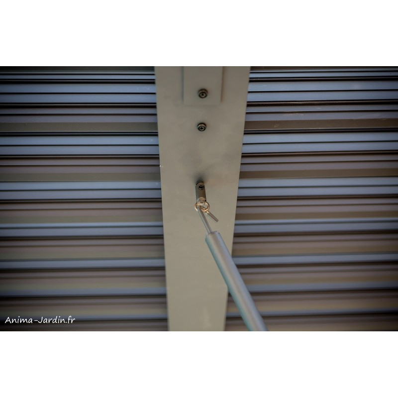 | Informations techniques | Poteaux aluminium Lames ovales 90 mm orientables, pivotant jusqu'à 90° environ. Ouverture et fermeture des lames orientables avec une seule manivelle |