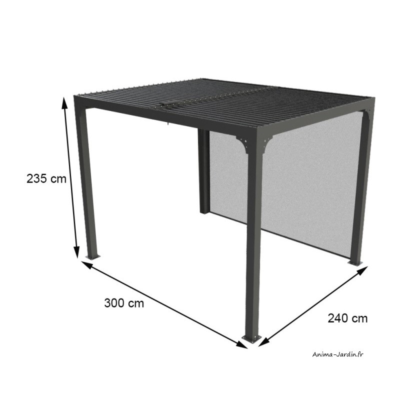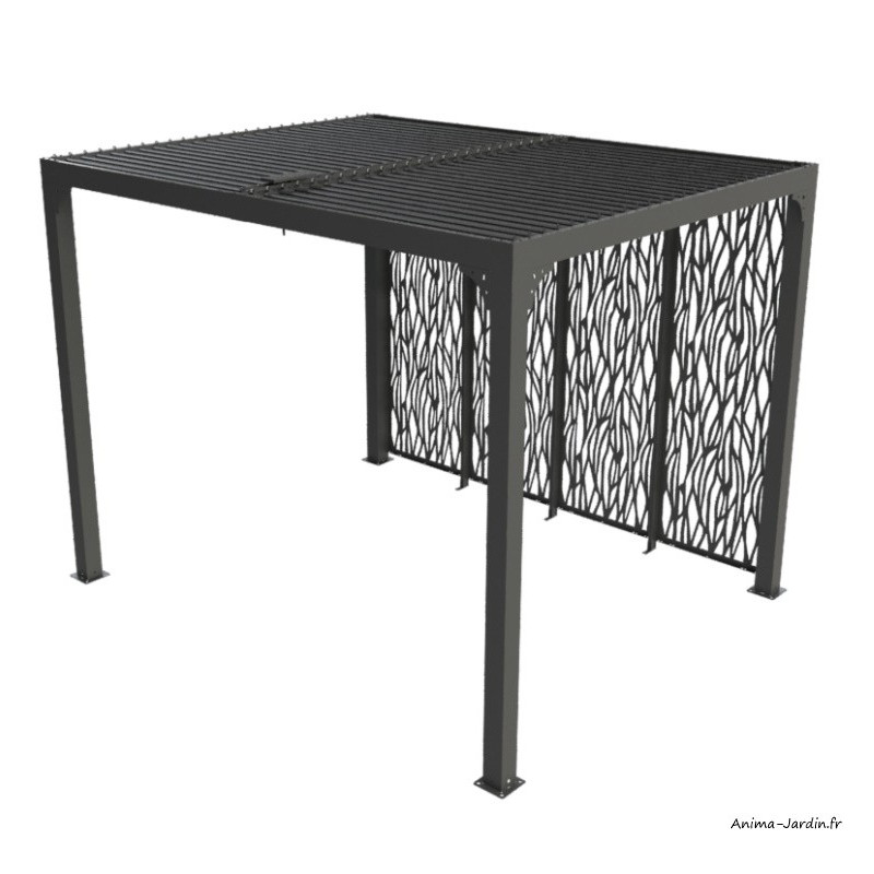 Options possibles : 4 panneaux moucharabieh coloris gris pour côté 3 m, 1 store coloris gris pour côté 3 m ou 2 stores pour côté 3 m et côté 2,40 m.