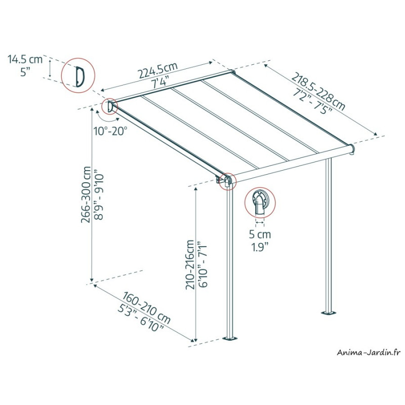 - L.224,5 x l.218,5-228 x H.226-300 cm soit 5 m² (réglable) |