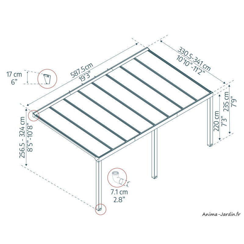 - L.587,5 x l.330,5-341 x H.256,5-324 cm soit 20 m² (réglable)