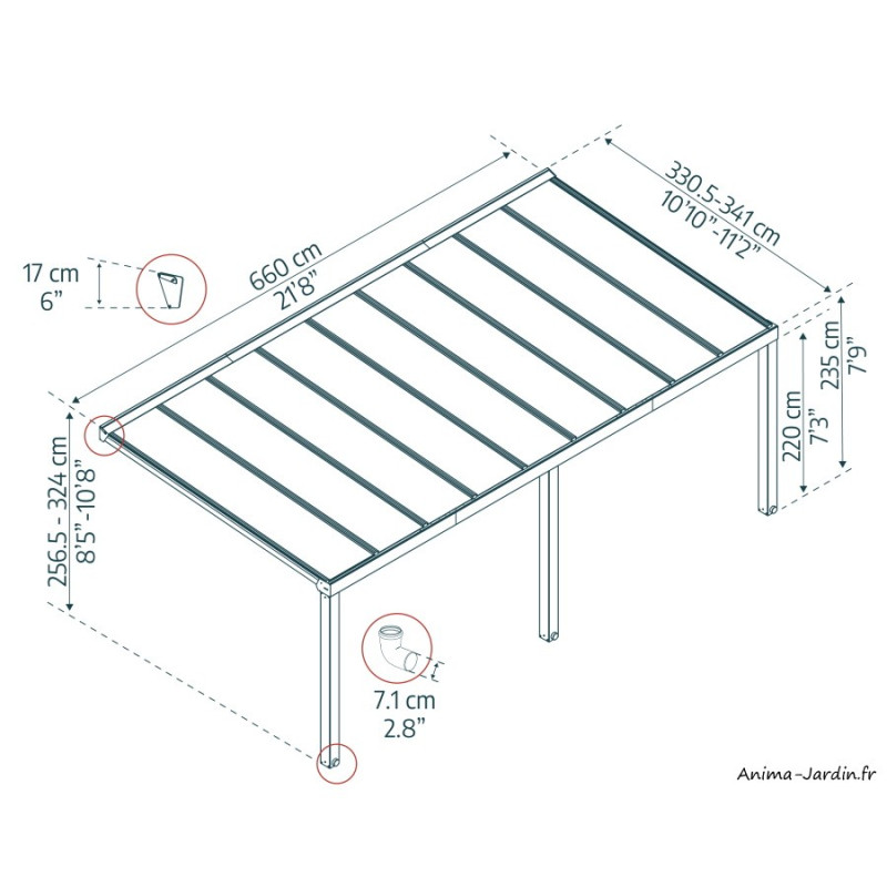 - L.660 x l.330,5-341 x H.256,5-324 cm soit 22,5 m² (réglable)