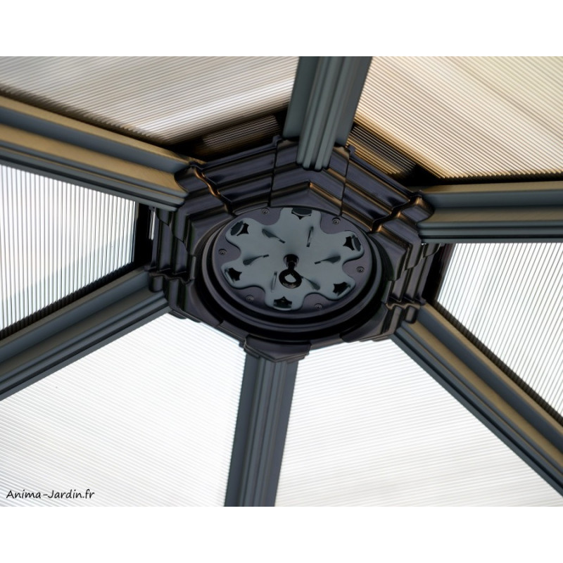 Optez sans hésiter pour la majestueuse tonnelle Roma de 14,9 m² en aluminium. Arborant une silhouette hexagonale, elle insuffle une note d'élégance originale à votre espace extérieur, créant un cocon d'exception. Avec un toit en polycarbonate alvéolaire de 6 mm d'épaisseur qui vous assure une protection sans faille contre les intempéries.